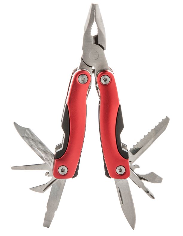 Tools include: needle-nosed pliers, normal pliers, wire cutters, knife, Phillips screwdriver, flat screwdriver, saw, can opener, bottle opener, wire stripper, carabiner.