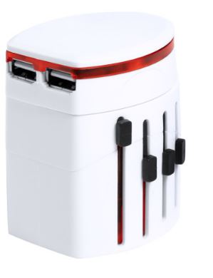 Universal travel adapter in plastic with 2 USB contacts. Max. output: 2100 mA.